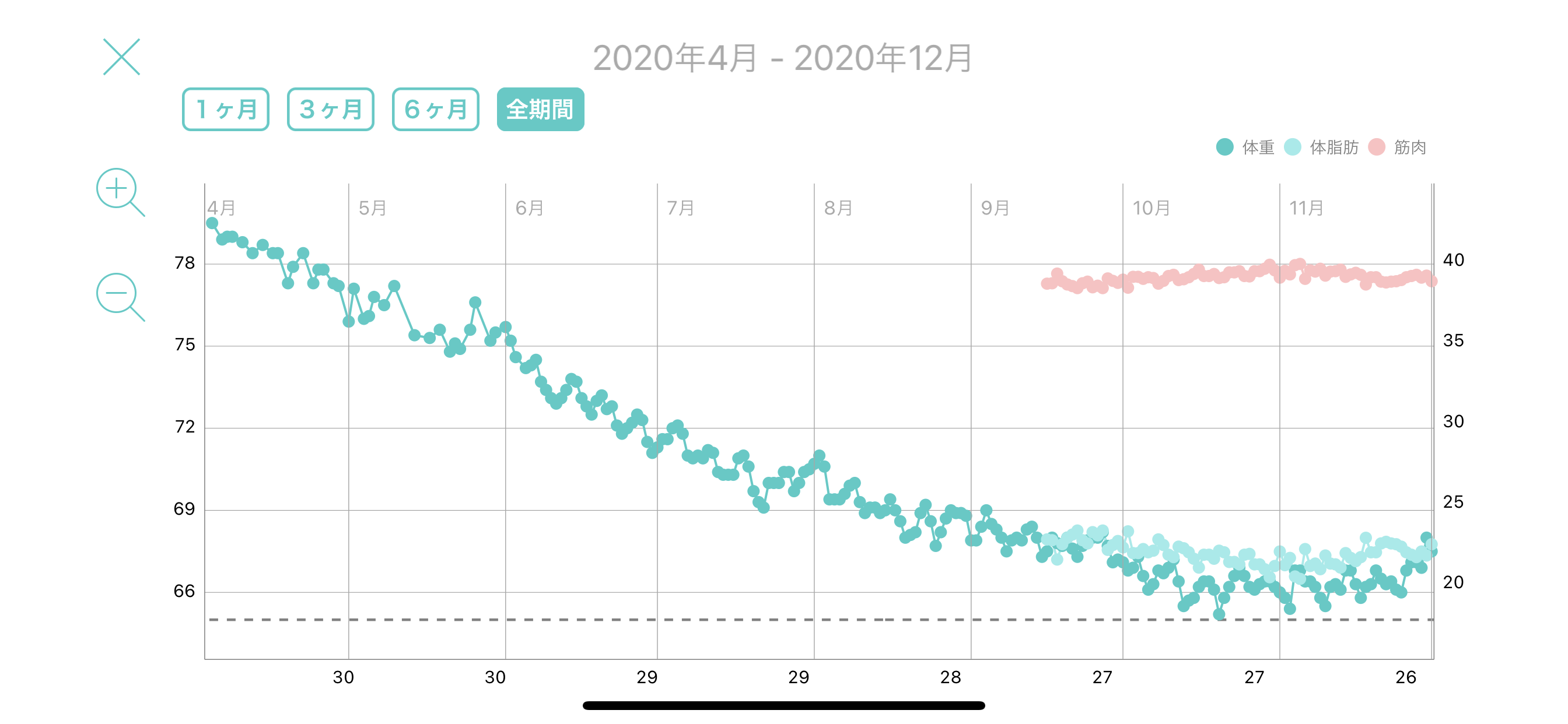 いい感じで体重が落ちて行きましたが、70kgを切る8月くらいから少し停滞期に。
