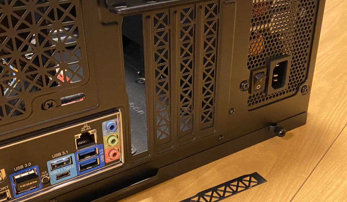 グラフィックボード(GPU)はディスプレイ端子(HDMI、DisplayPortなど)を出す必要があるので、ケースの横のPCIカード用の穴を開ける必要があります。
