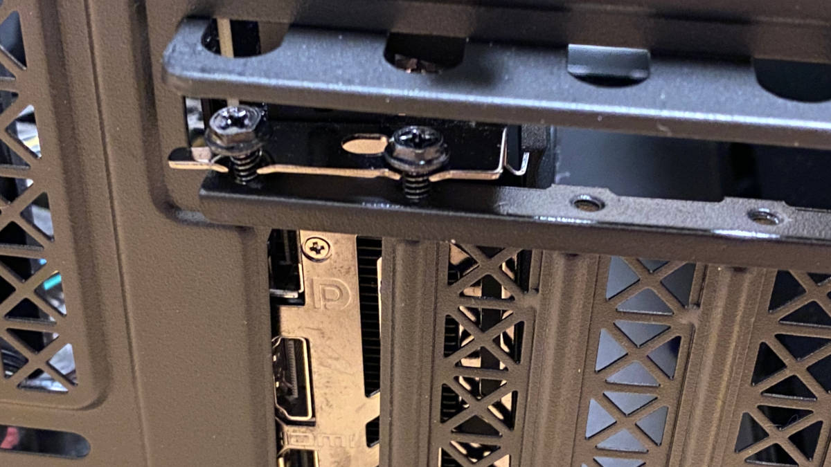 マザーボードのPCI-Eポートにグラフィックボードを差して、ケースにねじ止めします。