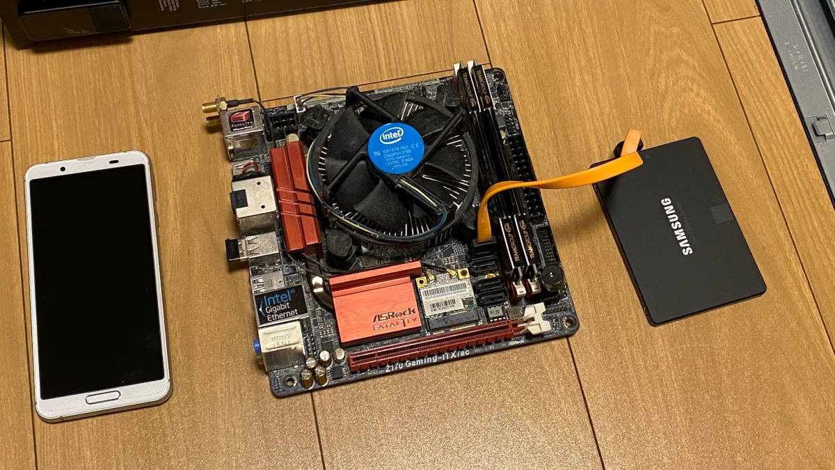 横のスマホは Android の Aquos SHV45(5.5インチ)ですが、iphone13 などと同じくらいのサイズなので、mini ITX の小ささがわかりますね。