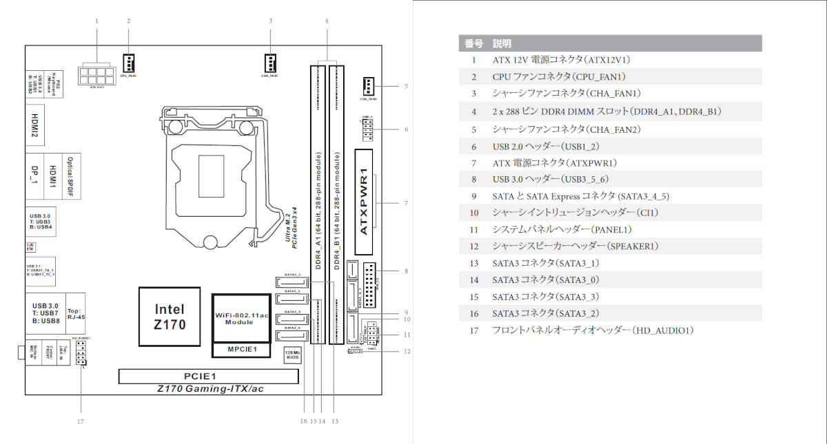マザー(Fatal1ty Z170 Gaming-ITX)のマニュアル p7、p9 で確認すると、No.11がパネルヘッダーで POWER、RESET、HDD LEDを接続するところです。